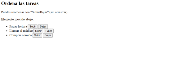 Esta es una alternativa operable con un único puntero (botones “Subir/Bajar”) para conseguir el mismo resultado que el arrastre: reordenar elementos.