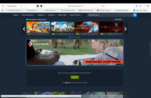 A la imatge que he adjuntat apareix al centre un requadre amb el títol "Steam Deck", el contingut d'aquest requadre són 4 vídeos que s'alternen entre si, apareixent un darrere de l'altre, el problema es dona, ja que el període de canvi d'un vídeo a l'altre és de menys de tres segons.