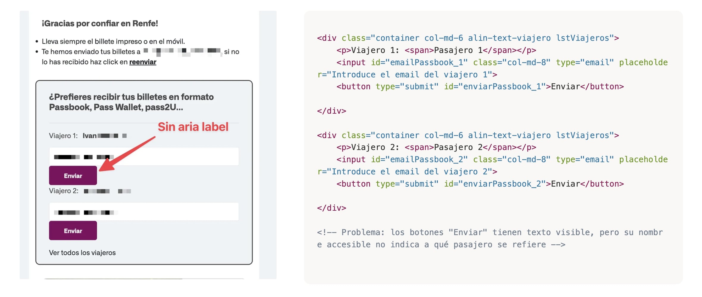 Página que usa botones pero no contiene aria-label ni describe bien a qué usuarios se le enviar la información (hay más de un usuario al que enviarlo)