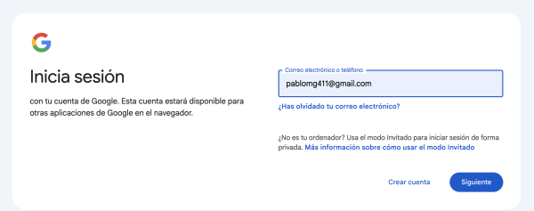 <div style="border: 1px solid #ccc; padding: 20px; border-radius: 8px;"> <label for="email" style="display:block; color:#1a73e8; font-size:0.8em; margin-bottom:4px;"> Correo electrónico o teléfono </label> <input type="text" id="email" name="email" value="pablomg411@gmail.com" style="width: 95%; padding: 10px; border: 1px solid #1a73e8; border-radius: 4px;"> </div>