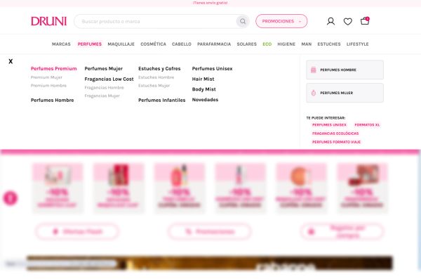 Al llevar el ratón y hacer hover por encima de los elementos de la navbar se despliega toda una variedad de opciones de productos, pero en ningún momento se quitan, ni al quitar el ratón del sitio en el que inicialmente hiciste hover. El problema está en que no hay ningún botón de "X" para poder salir de ese menú desplegable que ocupa toda la pantalla. Entonces la única manera de salir es hacer click en cualquier otro link del navbar o volver a la página principal de Druni haciendo click en el logo.