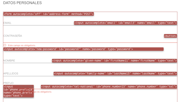 Además, el contenido de los atributos autocomplete tienen que seguir los criterios establecidos en: https://www.w3.org/TR/WCAG21/#input-purposes. En el formulario de la imagen, también se siguen estos criterios establecidos.