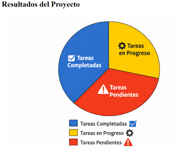 <h1>Resultados del Proyecto</h1> <img src="grafico_colores.png", width="500" height="300" alt="Gráfico que muestra tareas completadas, en progreso y pendientes, con colores"> <p>En este grafico, el color azul representa tareas completadas, el amarillo tareas en progreso y el rojo tareas pendientes.</p>