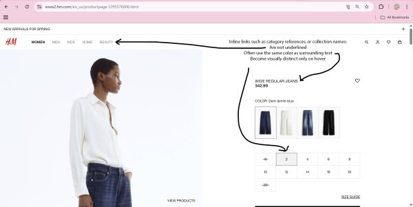 Revisión del 20:00 17 feb 2026 de 202526UdL42 (discusión | contribs.) (The text compares an inaccessible example (H&M) with an accessible one (GOV.UK). H&M relies on color and hover effects to identify links, which fails WCAG 1.4.1 and makes navigation difficult for users with color blindness, low vision, or keyboard-only access. GOV.UK uses underlining, high contrast, and clear focus styles, meeting accessibility standards and ensuring links are easy to identify for all users.)