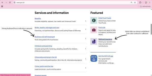 Links are not identified by color alone. Underlining provides a persistent visual cue. High contrast ensures visibility for low-vision users. Clear focus styles support keyboard navigation. This fully complies with WCAG 1.4.1-B and technique G183.